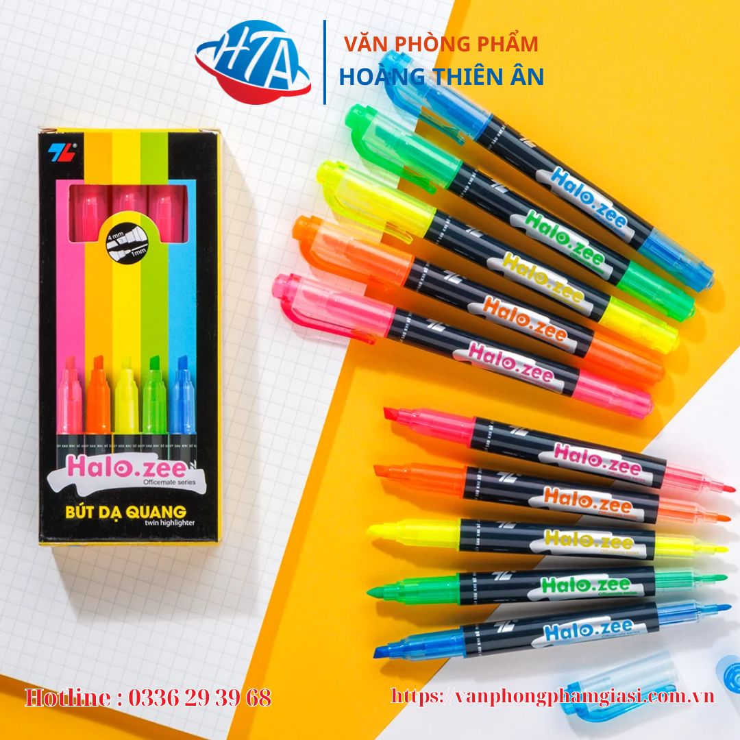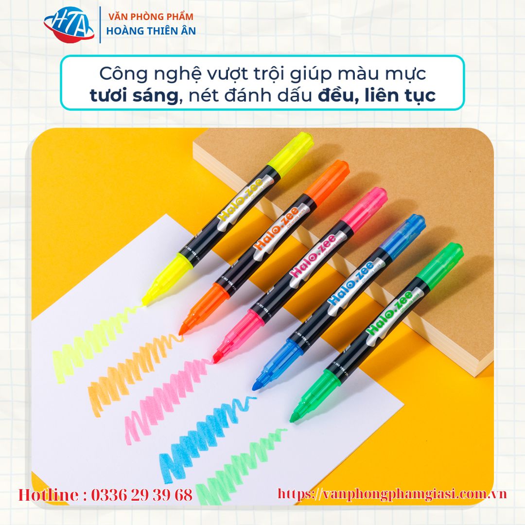 - Kiểu dáng thon gọn, trẻ trung Màu dạ quang mạnh, không làm lem nét chữ của mực khi viết chồng lên và không để lại vết khi qua photocopy đây là đặt điểm vượt trội của bút dạ quang HL03.