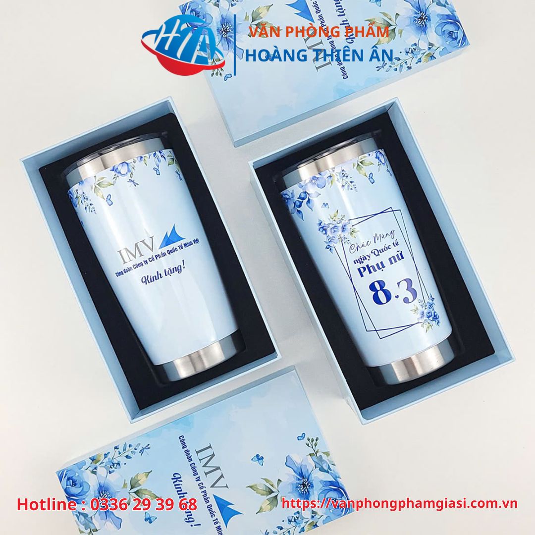- Ly giữ nhiệt in logo 8/3 dung tích 600ml cùng họa tiết hoa xanh xung quanh ly với chất liệu inox 304 và khả năng giữ nhiệt từ 6-8 tiếng