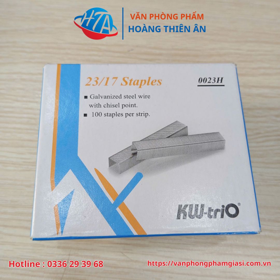 - Kích thước: Mã sản phẩm KIM BẤM KW.TRIO 23/17 cho biết khổ dây kim là 23-gauge và chiều dài chân kim là 17mm. Chiều rộng của thân kim (bề ngang) khoảng 12mm.